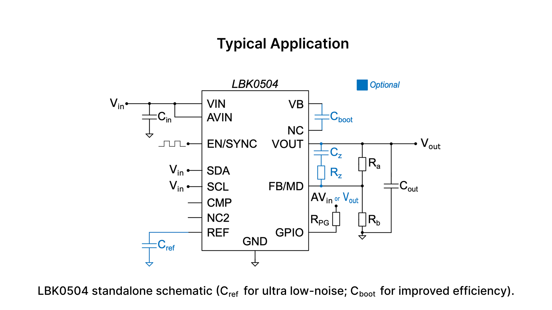 The device can be used in parallel to multiply the output current (up to 4 phases in parallel). The LBK0504 features ultra low-noise performance, making it a primary candidate for low-noise applications.